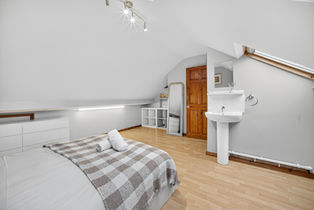 The apartment features a bright open-plan living and dining area, a fully equipped kitchen with essentials, and complimentary tea and coffee. There are five bedrooms (three doubles, one king, and one bunk room) with hotel-quality linen, plus two modern bathrooms with fresh towels and toiletries.
