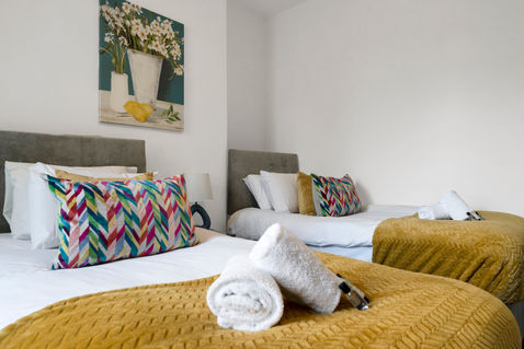 The property features hotel-quality beds with fresh linen, configurable link beds on request, and spotless bathrooms with fresh towels and complimentary toiletries. The fully equipped kitchen includes modern appliances, cookware, cleaning supplies, and complimentary tea, coffee, biscuits, and sweet treats.